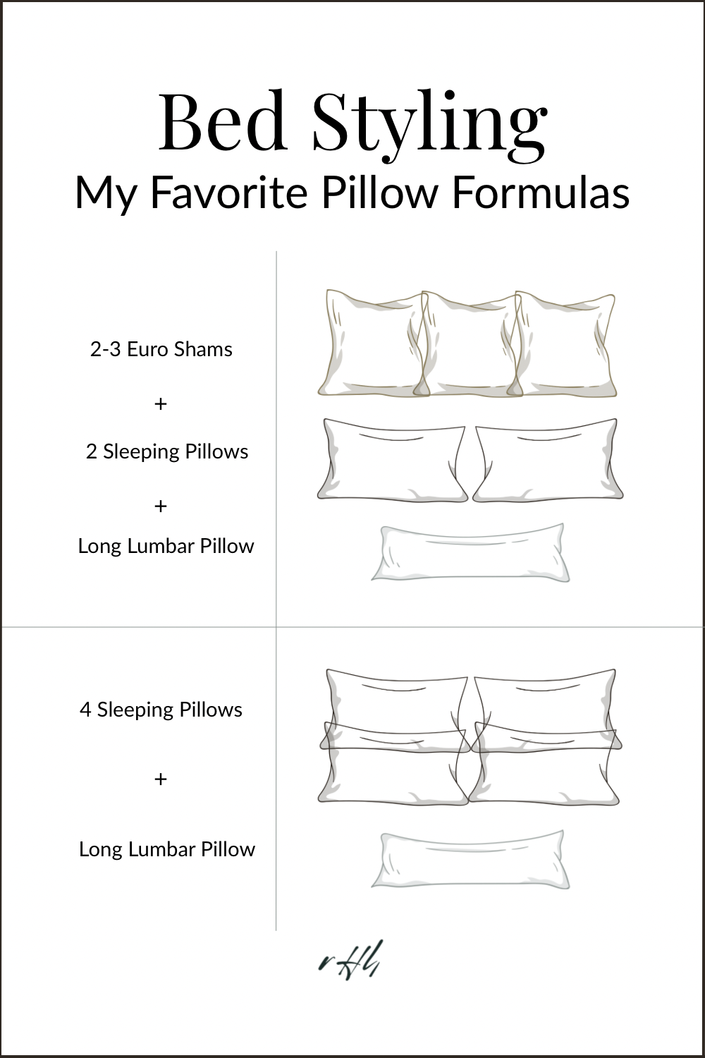 Tip: A more minimalist version of this look would include 4 sleeping pillows (2 in shams, 2 in pillowcases) and a long lumbar pillow in front.