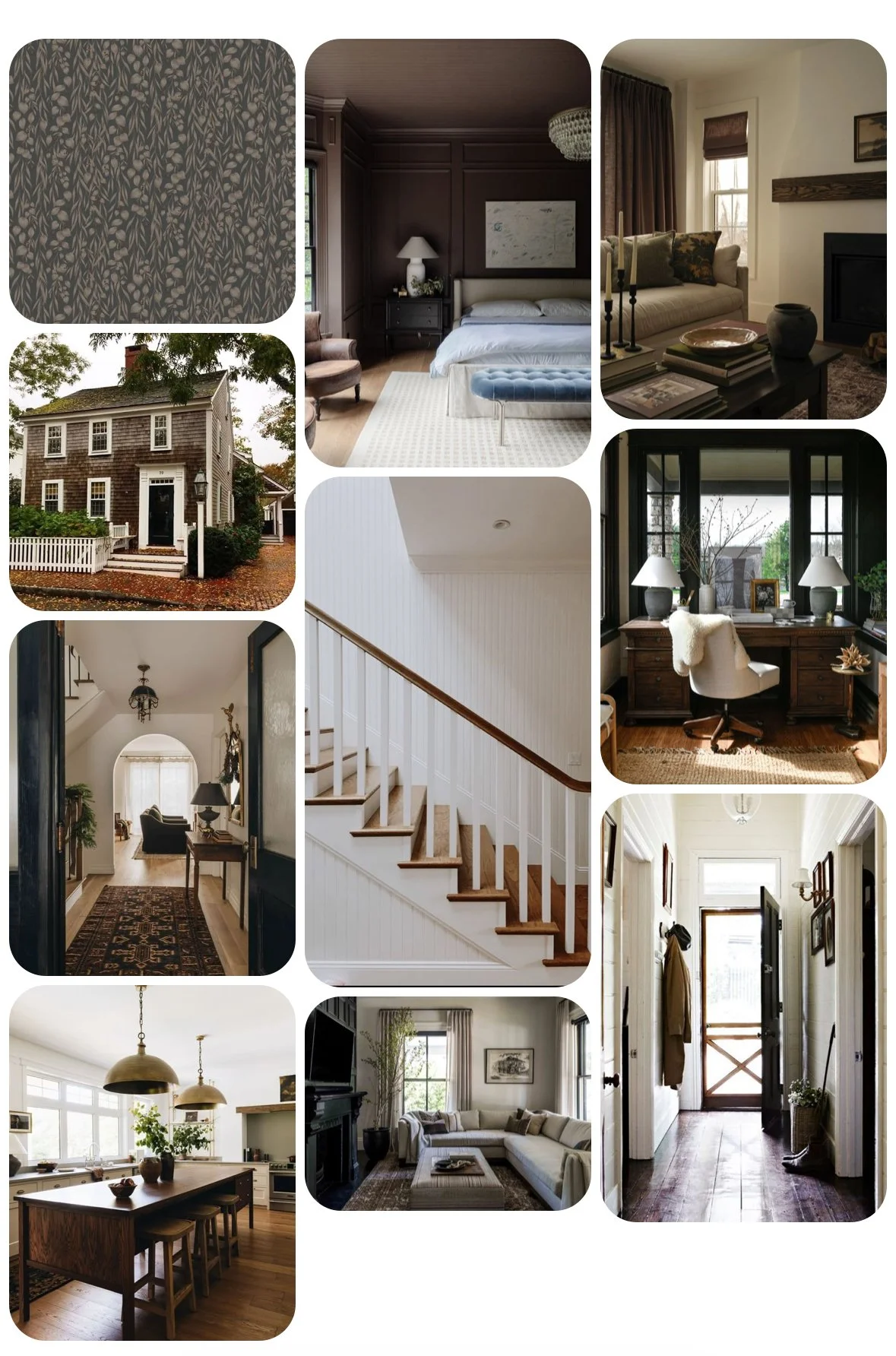 Can you see the pattern? Just like my fashion board, I love moody neutrals contrasted against lighter colors. I see warm mid-dark toned wood, white walls in main living spaces, a few blue moments, darker bedroom and office, and casual spaces with hints of formality. Look at the house exterior I saved. Weathered shingles, black painted door, white picket fence, and brick walkway. It’s me, in a nutshell. I’m pretty sure we’re both New Englanders, too.